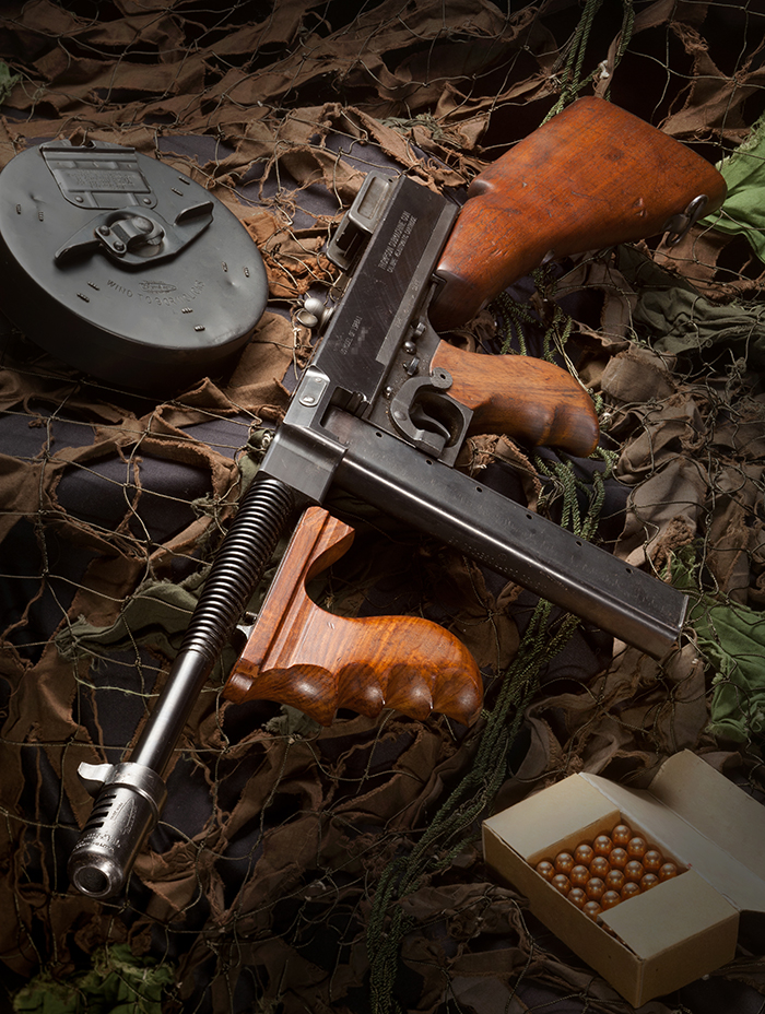 そんなトンプソンSMGの名前を一躍有名にしたのは、禁酒法(1920-33)の恩恵を受けて急成長していたマフィアなどのギャングが、トミーガンを愛用し始めたことによる。当時アメリカでの銃規制は緩やかそのもので、トミーガンはメールオーダーや最寄のスポーツショップで簡単に手に入れることが出来たのだ。ジョージ“マシンガン”・ケリー、アル・カポネ、ジョン・デリンジャーといった名の知れたギャングスター達がトンプソンSMGを愛用し、メディアによって喧伝された“マシンガン=トミーガン”は、一般にも認知されていったのだ。