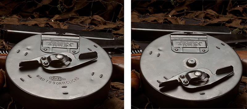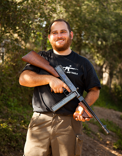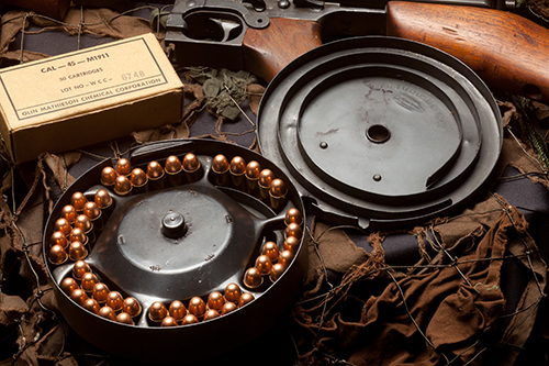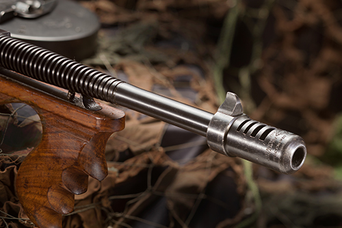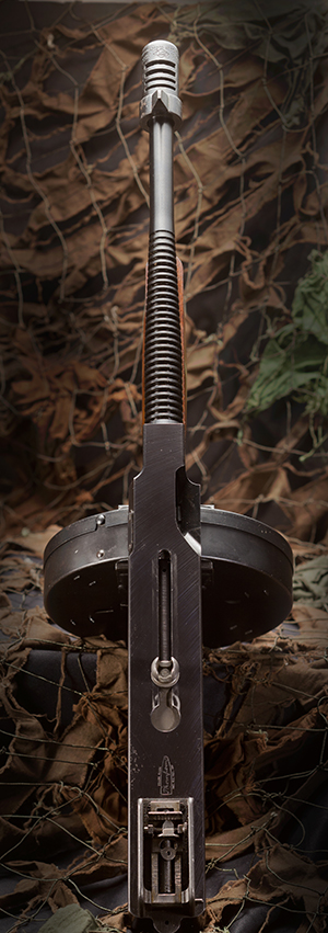 以前HK MP5の取材でお世話になったAaron(アレン)の工房には、それこそ世界中のマシンガンが顔を揃えている。拳銃弾を使用する“サブマシンガン”カテゴリーも充実していて、M3グリースガンやステンMk.IIに混ざって、このトンプソンM1928A1が燦然と光り輝いていた。ここで白状してしまうと、MP5実射の撮影に、M1928A1とMP40を無理やり入れてもらったのは私である。もう20年以上前に、ガンスミスのロン・パワーさんの工房を訪れた際、M1921を撃たせてもらったことがあった。30連マガジンを全弾水溜りにぶち込むという遊びの面白さは、これはもう筆舌に尽くしがたいものがある。アレンの工房で、M1928A1と3個の50連マガジンを見つけてしまった私は、彼の後ろに後光を見たような気分であったのだ。