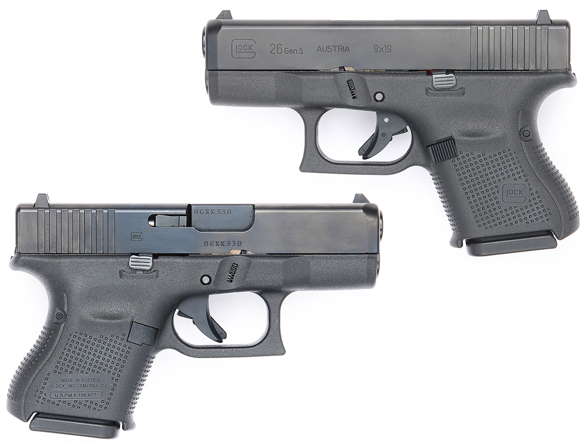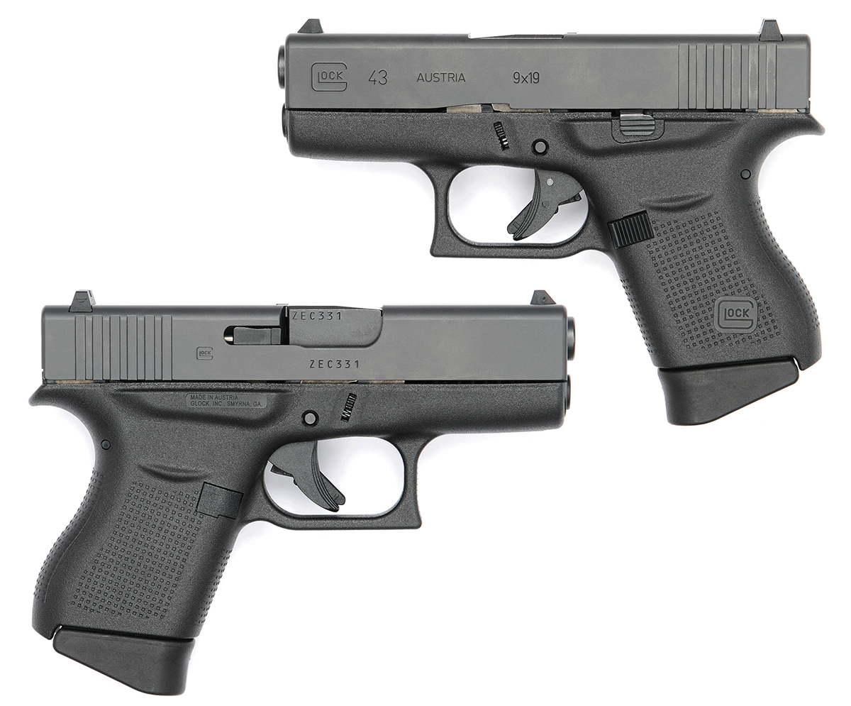 秘匿携行性を重視してデザインされたG36は、明確なコンセプトをもつ同社スリムラインシリーズの先駆けとなったが、その後しばらくはシリーズ唯一の存在であった。次作が発表されたのは2014年のことで、ディフェンシブガンではミニマムパワーと考えられている.380 ACPを使用するG42は、現在でもグロック最小のキャリーガンだ。銃身長は3.25インチ、シングルスタックのマガジン装弾数は6発で、発売直後から大ヒットとなった。小型軽量で幅も薄く、フロントポケットに入れて携行することも可能だ。しかしながら.380 ACPではパワー不足という意見もあり、9×19mm版を求める声も多かった。翌年の2015年に発表されたG43は、G42を若干大型化させて9×19mmに対応させたスリムなサブコンパクトサイズで、G42に勝るとも劣らない大ヒット製品となり、9mmコンシールドキャリーガンの代表的存在となって現在に至る。
