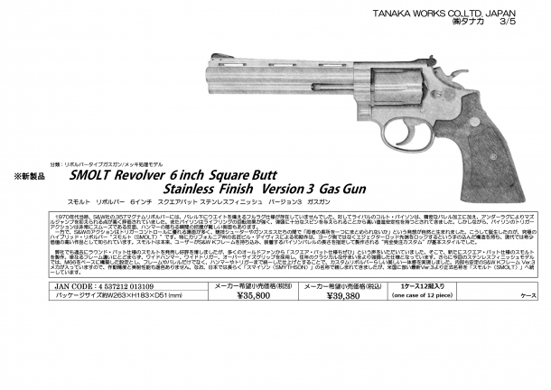 『SMOLT Revolver 6inch Square Butt Stainless Finish Ver.3 Gas Gun』