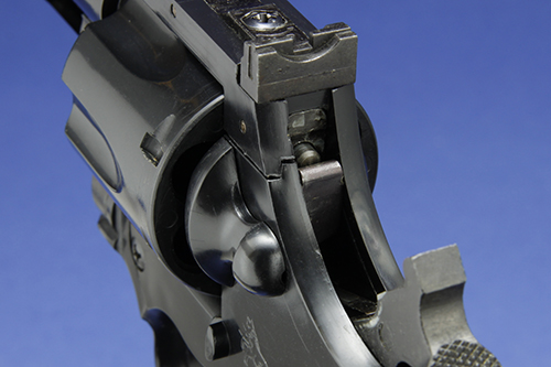 フレームは、最初からラウンドバット、スクウェアバット、オーバーバットの3種類のグリップが装着できるように、フレームのヒール部分のコーナーを落としてデザインされた。これもすばらしいアイデアで、現在の実銃リボルバーでこの形式にしたものも見かける。グリップをバックストラップ部分まで回して反動を軽減するのがメインの目的かもしれないが、小林さんの着眼点の鋭さがここにも伺える気がする。