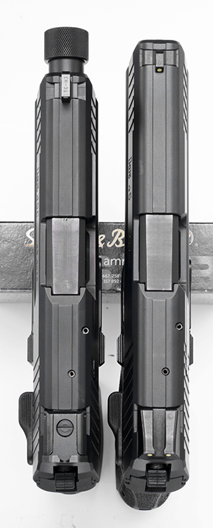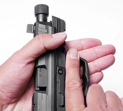 VP9には9mmの他に.40S&WのVP40もあるが、現時点で.45ACPモデルは未発売だ。数年以内に全体を大型化しHK45のマガジンを使用するVP45が登場しても驚きはしないが、現在のH&Kの主力.45オートは、いうまでもなくHK45シリーズだ。大きすぎる印象の強かったUSP45の弱点を改良した発展型で、装弾数を減らしてまで握りやすくしたグリップには得意の人間工学が活かされている。特にそのコンパクトであるHK45C(Compact)、及びHK45CT(Compact Tactical)は、NAVY SEALSでも使用されているモデルであり、安定した人気を誇っている。