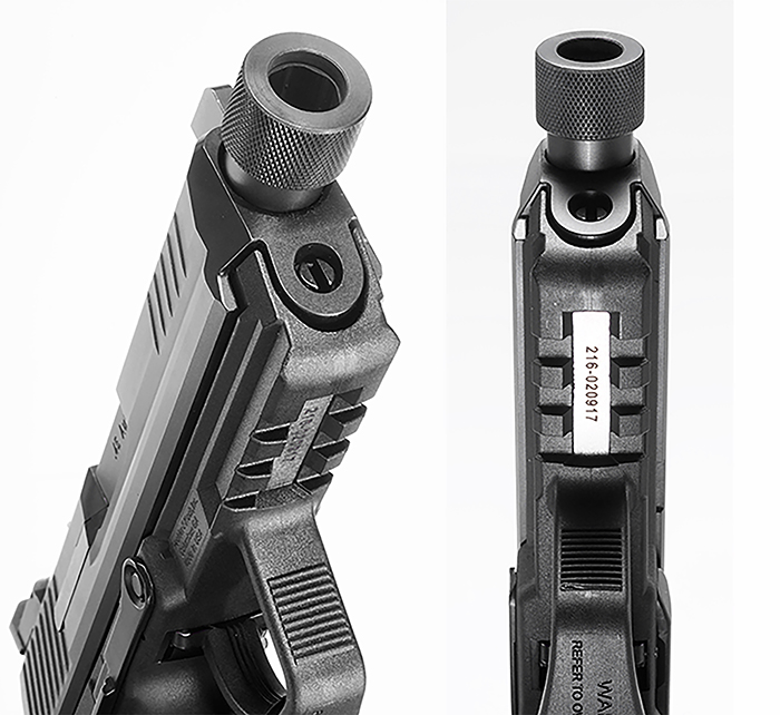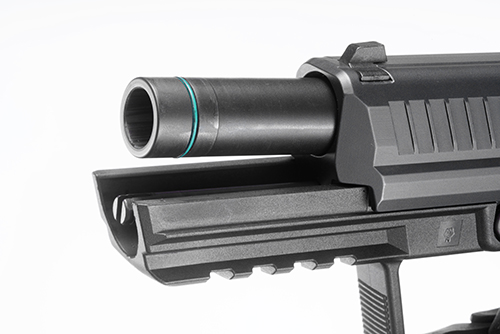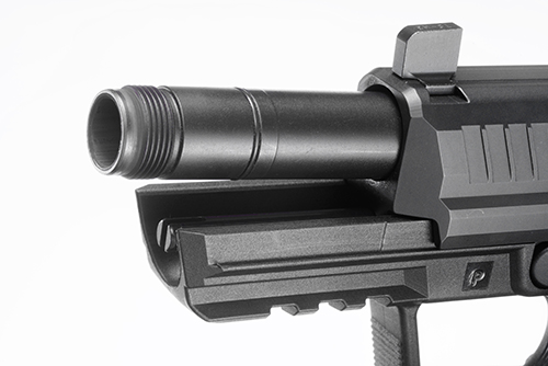 HK45CTはHK45を小型化したHK45Cに、スレデッドバレルとサプレッサーサイト(ハイプロファイルサイト)を追加したタクティカルモデルだ(HK45にも同仕様のHK45タクティカルがある)。付属のフィンガーレスト付きマガジンエクステンションを装着した10連マガジンにより、コンパクトといっても実際にはフルサイズとほとんど同じような大きさになっている。