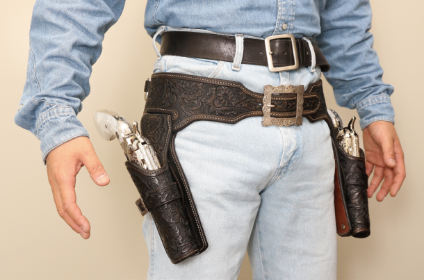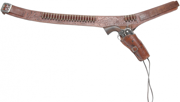 最高級のガンベルトは、いつも私を最高の気分にさせてくれる。だが高価じゃなければそういう気分になれない訳じゃない。ここはくれぐれも誤解しないでいただきたいところだ。既製品のガンベルトはシンプルなデザインが大半だが、多くの西部劇に登場するガンベルトはシンプルな物だし(だから西部劇のコスプレをするにはそういう物が必要だ)、「シンプルだからこそ飽きがこない」というのもある。そして本革製のガンベルトを長く使えば、それだけ愛着も湧く。たまに私の使い古しの既製品のガンベルトを「安く売ってください」という人がいるが、とんでもない!! 長く使って小傷も多く色落ちしていれば、それは“革製品ならではの味”なのだ。その人は「その味を出すためにどれだけ使い込めばよいか」をまったく分かっていない。ハッキリ言って新品ピカピカのガンベルトより、使い込まれた味のあるもののほうが断然、カッコイイのだ(もちろん手入れを怠っての単なる劣化は論外)。だから売るつもりはないが、もし売るなら買った時より高く売りたい位だ。