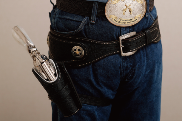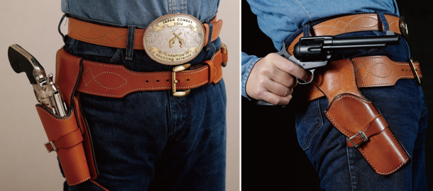 ウエスタンガンベルト No.001をファストドロウで愛用する多くのシューターは右写真のようにホルスターをオーバーハングへと組み直している。T. K. Hero 江田さん愛用のガンベルトも、この吊り方とPPシートのライナーの組み合わせだ