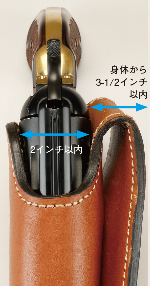 ● ホルスターは構えた状態で横から見たときに、フレームの付け根からバレルの全部とシリンダーの50%をカバーしなければならない。