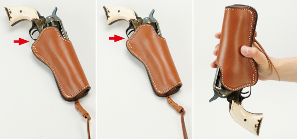 ネオ・カウボーイ レザーは価格を抑えるため、あえてメタルライニングにはしなかった。メタルライニングとは、ホルスターの二枚重ねの革の間に金属板を挟むことでホルスターの形を同じに保ち、SAAをホルスターに入れたままシリンダーが抵抗なく回転できるようするものだ。メタルライニングではないため、買った新品のままだとSAAが革に挟まれてタイトに収まる。SAAをホルスターへ軽く挿したところが左写真だ。ファストドロウ用のホルスターでは通常、トリガーガードがホルスターの中へ入らないものが多いが、本製品は力を入れて銃を押し込むとトリガーガードの前方までホルスターに入る仕様となっている(中央の写真)。こうすると逆さにしても銃が落ちない位のテンションで保持される。これは脱落防止として、サバゲなどで走り回っての激しいアクションで使用されるユーザーを考えてのものだ。ファストドロウで速く抜くためには、もう少し緩い方が良いので、その工夫を後述する