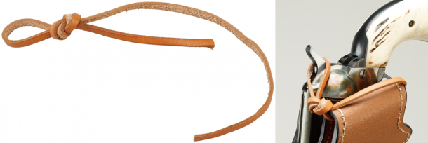 サバゲなどでの使用も考えて銃がタイトに収まるようになってはいるが、やはり早撃ち用のデザインのため、サバゲで激しく動くなら落下防止対策は必須だ。そこで本場アメリカ製のファストドロウ用ホルスターの多くがそうなっているように、ハンマースパーに引っ掛けるストラップを取り付けるとよい。例えば写真のように革紐(またはパラコードなどの適当な紐)を用意して60cmほどに切断、リングを作り、ホルスターの上部へ縛るので充分だ