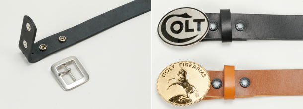 別売りの専用本革製ベルトは厚さ4mm、幅は39mmでガッシリとホルスターを保持する。ジーンズなどのパンツベルトとしても使用でき、バックルのピンを留める穴は7つと多めにあけられているため、ウエストから少し下げた腰まわりの位置への装着も可能だ。付属のスクエアギャリソン型のバックルはホックを外すことで簡単に取り外すことができ、お好みのバックルへ交換することができる。下の写真は交換した時の見本で、このコルト純正のバックルは私の私物で参考品だ。ちなみに写真のようなトロフィーバックルに交換するなら、サル革(赤矢印のループ部分)はあった方が良い。100円程度で売っているものもあれば、長さ10.5cmほどの短い革の帯とサル革留めの金具(50円程度)を使って簡単に自作することもできる。写真のサル革は私の自作だ
