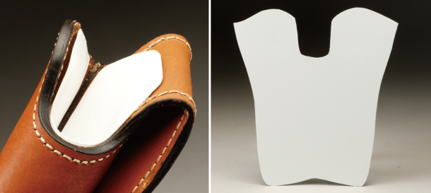 ネオ・カウボーイ レザーをさらにファストドロウ競技向けにする工夫をご紹介する。写真のようにPP(ポリプロピレン)シートを切り出してライナーにすると、銃を抜く時の摩擦を軽減できる。このPPシートは0.75mm厚でA3サイズならホームセンターにて数百円で買えるものだ。この工夫はファストドロウ日本チャンピオンのT. K. Hero江田さんから教えてもらった。なお、ネオ・カウボーイ レザーは発売前に最終試作を江田さんにもテストで使ってもらい、全国大会で上位入賞が狙える物であることを確認してもらっている