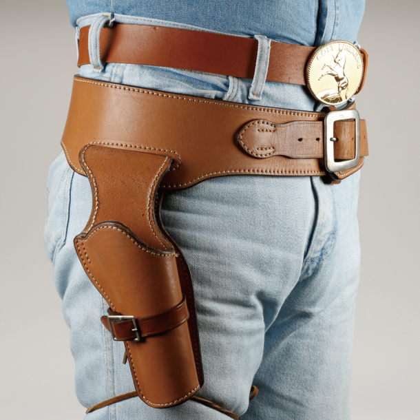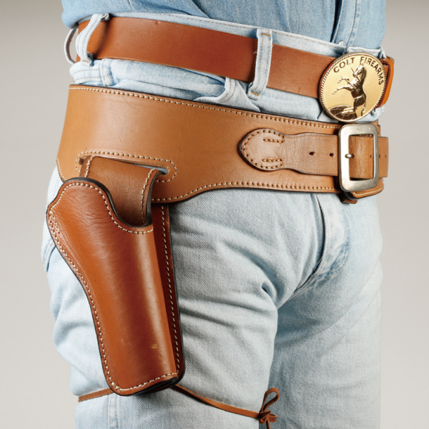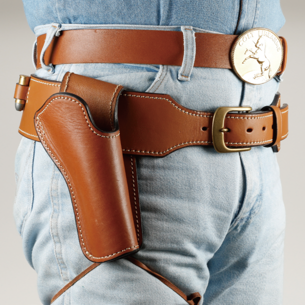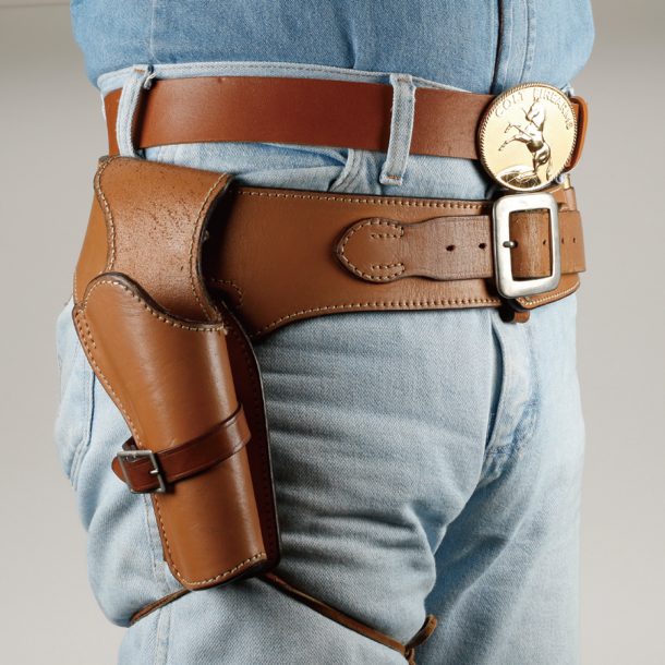 これは先ほどご紹介したイースト.Aのウエスタンガンベルト No.001だ(No.002は左右の2挺吊り)。ベルトの下側にスリットを切って、そこにホルスターを吊るすバスカデロスタイルとして、この状態で売られている。西部劇ではおなじみの人気のスタイルだが、ファストドロウでタイムを追求するには、ホルスターの位置が少し低い