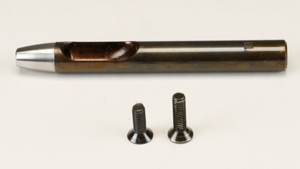 キャプション穴を開けるためのサークルポンチ(ハトメ抜き)は18号(5.4mm)だ。合わせてホルスターの革の間にベルトを挟むため、付属のネジのM4×12mmでは長さが不足するため、M4×16mmへ交換する必要もある