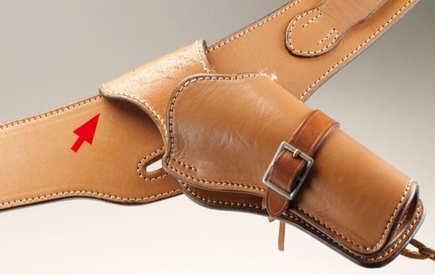 先に述べたとおり、このウエスタンガンベルト No.001はホルスターの矢印の部分が、人によっては中指の先が引っかかりスムーズなドロウを妨げる場合がある。私はこれが気になって仕方がないが、江田さんはまったく問題ないそうだ。だが私と同じように気になる人は少なくないようで、引っかかる部分を内側に曲げたり、カットしたりといろいろ工夫しているようだ