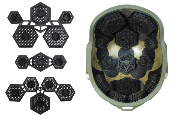 樹脂を微細な3D骨格で構成することで適度な弾力、安定性に通気性と快適性を兼ね備えたヘルメットパッド。アメリカ陸軍の耐衝撃試験に対応する保護性能を備える。