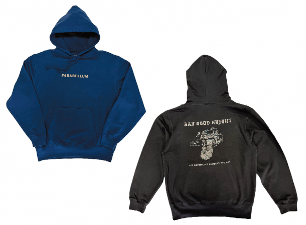 日本の元特殊部隊員によるアパレルブランドのフーディに新色が登場。インディゴ、墨それぞれに同社のシンボル「BAR GOOD KNIGHT」をカモフラパターンでプリント。