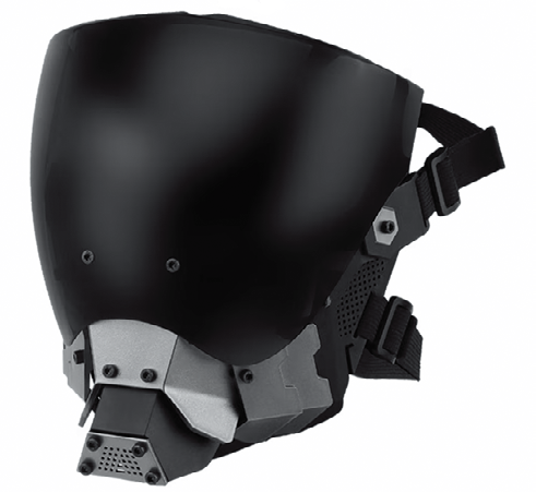 顔全体を覆う近未来デザインのフェイスガード。ナイロン樹脂で成形したボディの内側にはソフトなシリコンマスクを備え、レンズは曇り止め加工を施したポリカーボネート製。