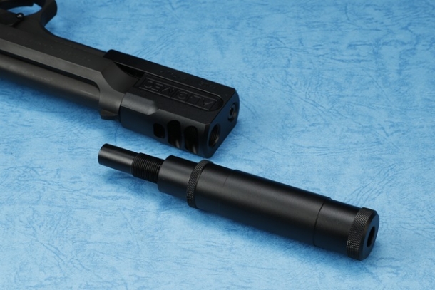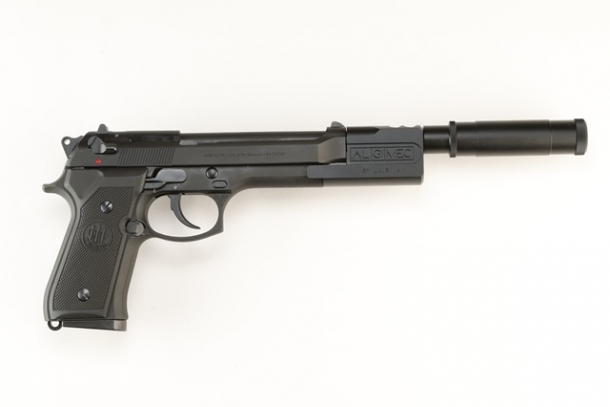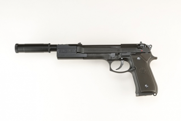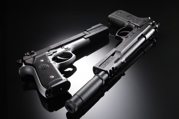 1988年製のシリアルナンバー「D45283Z」のベレッタ92FSをベースにしたオールブラックモデル。コンペンセイター先端に正ネジが追加され、リアルな形状だけではなく専用樹脂製バッフルも内蔵したサイレンサーが装着可能。減音効果に加えてリコイルショックもマイルドに変化するという。