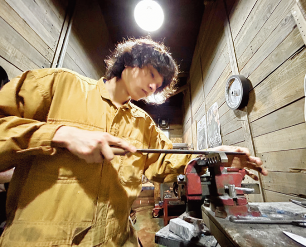 池添さんは、埼玉県在住。家業の自動車整備工場に従事しながら、ナイフ製作に勤しむ。