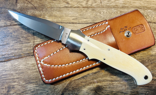 昨年のJKGナイフコンテストで大賞を受賞した池添雄太さん。ジェス・ホーンのニューヨークスペシャルのレプリカという、米モダンナイフのレジェンドたちをオマージュするかのような作品は、シースも含めた精緻な仕上げと破綻のないデザインで審査員たちを魅了した。